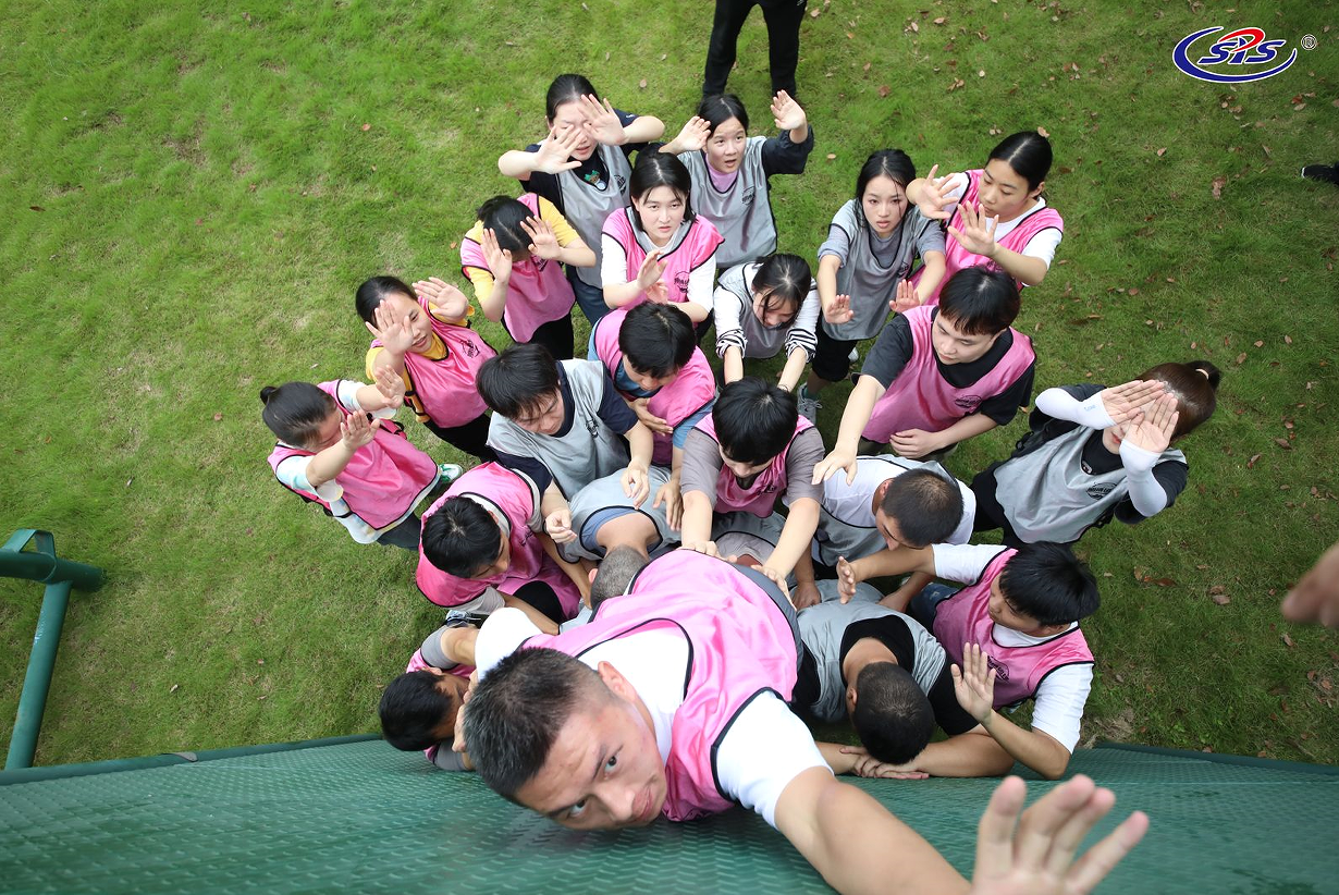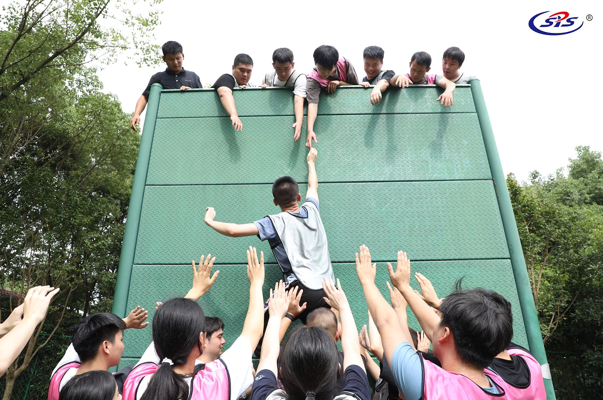求生墙是所有成员在规定的时间内翻越一面高4.2米的光滑墙面,而且在此过程中,不能借助任何外界的工具和外力,所能用的资源也只有每个人的身体。刚开始的时候,所有的伙伴们都认为这件事情根本无法做到,但是在所有队员的无私付出与努力下,真正做到了不抛弃不放弃,集体翻越了这面高墙。